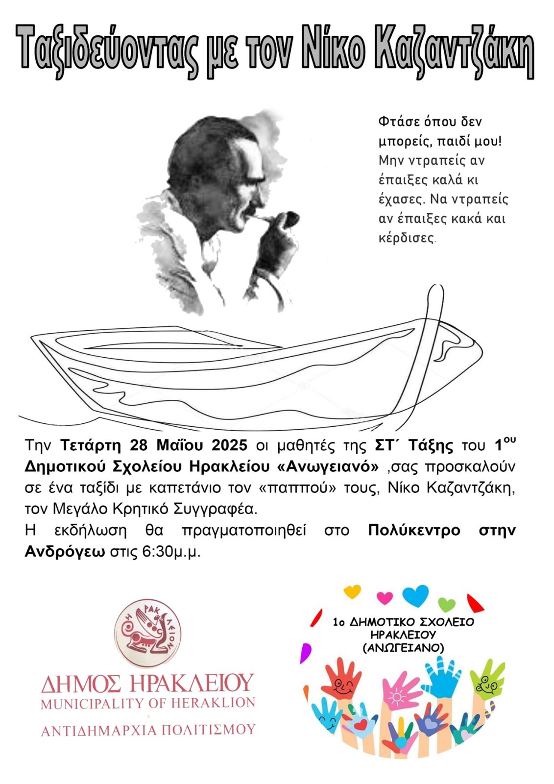 Περισσότερα στον σύνδεσμο: https://www.heraklionculture.gr/events_all/taxideuontas-me-ton-niko-kazantzaki/