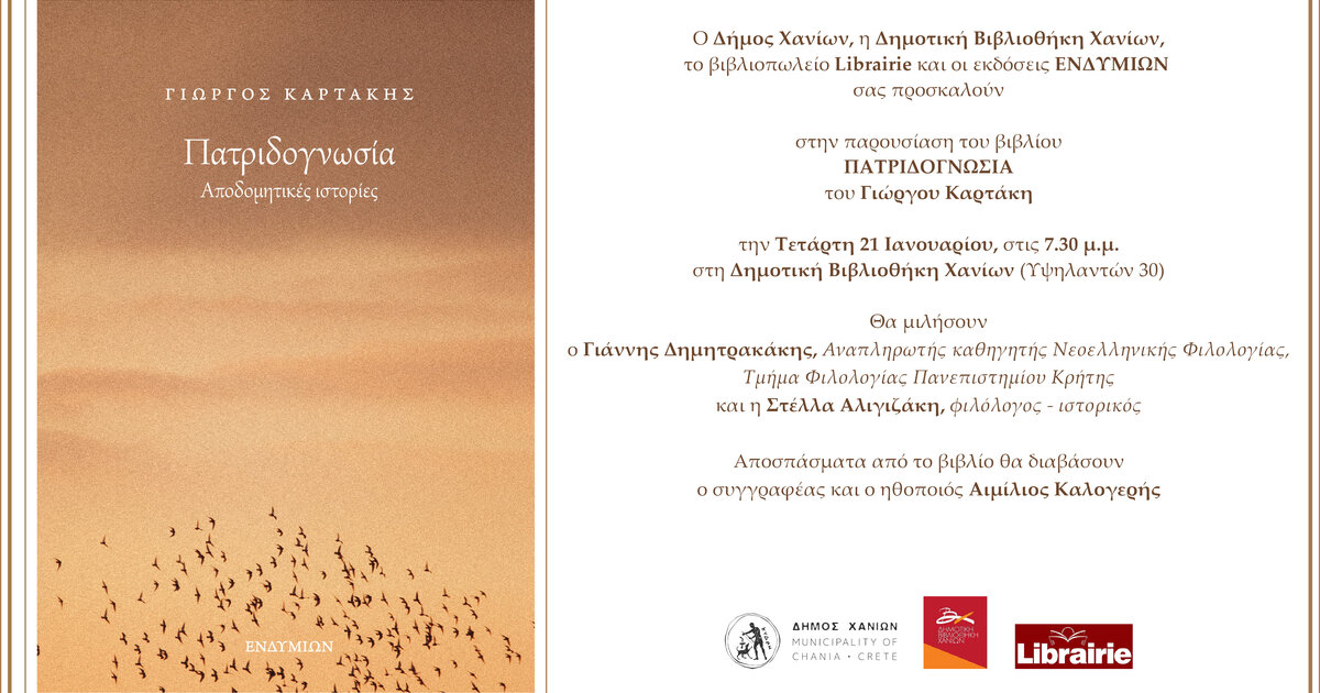 Ο Δήμος Χανίων, η Δημοτική Βιβλιοθήκη Χανίων, το βιβλιοπωλείο Librairie και οι εκδόσεις ΕΝΔΥΜΙΩΝ διοργανώνουν την παρουσίαση του βιβλίου του Γιώργου Καρτάκη με τίτλο «Πατριδογνωσία», την Τετάρτη 21 Ιανουαρίου, στις 7:30 μ.μ., στη Δημοτική Βιβλιοθήκη Χανίων (Υψηλαντών 30).