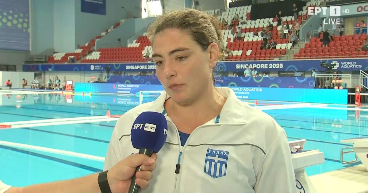 Η Ελληνίδα φουνταριστή μίλησε στην κάμερα της Δημόσιας Τηλεόρασης, λίγα λεπτά μετά τη σπουδαία νίκη σε βάρος της Αυστραλίας στον προημιτελικό του Παγκοσμίου Πρωταθλήματος υγρού στίβου.