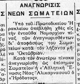 Είχαν περάσει δέκα χρόνια από το 1922 και τον μεγάλο ξεριζωμό, όταν το 1932 Μικρασιάτες πρόσφυγες από την Αλικαρνασσό, (Βodrum, όπως τη λένε οι Τούρκοι, αλλά και Πετρούμι στα ελληνικά εκείνων των χρόνων) που είχαν πια εγκατασταθεί στο Ηράκλειο της Κρήτης και είχαν ιδρύσει από το 1925 τη Νέα Αλικαρνασσό, αποφάσισαν να ιδρύσουν τον Ποδοσφαιρικό Αθλητικό Σύλλογο Αλικαρνασσού (Π.Α.Σ.Α.) «ΗΡΟΔΟΤΟΣ». Η απόφαση του Πρωτοδικείου Ηρακλείου βγήκε το Νοέμβριο του 1932. Η επιλογή του ονόματος δεν ήταν τυχαία, αλλά έγινε για να τιμήσει τον Ηρόδοτο τον πρώτο ιστορικό που καταγόταν από την Αλικαρνασσό και για να θυμίζει τη χαμένη πατρίδα. Η προτομή του ιστορικού είναι και το έμβλημα της ομάδας, που έχει χρώματα μπλε και άσπρο.