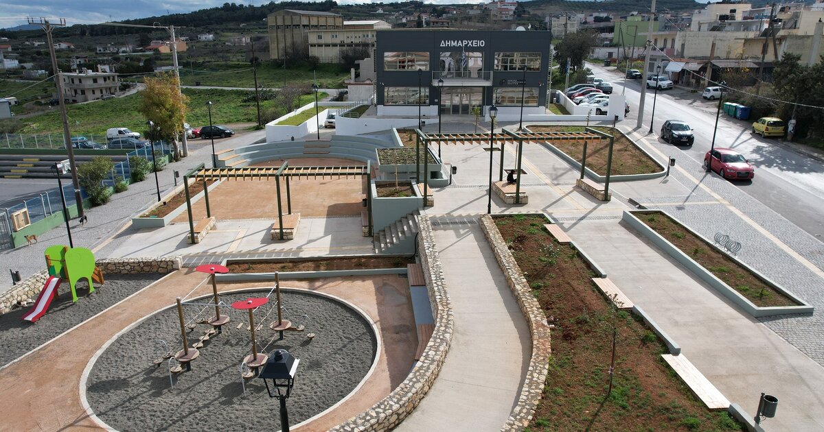 Στη νέα πλατεία που και κατασκευάστηκε το 2021 μπροστά από το Δημαρχείο Μινώα Πεδιάδος στο Αρκαλοχώρι (Αρχιτέκτονες: Μ.Μιχαηλίδου- Μ.Τσίτουρα), αντιμετωπίσαμε τις παραπάνω προκλήσεις.