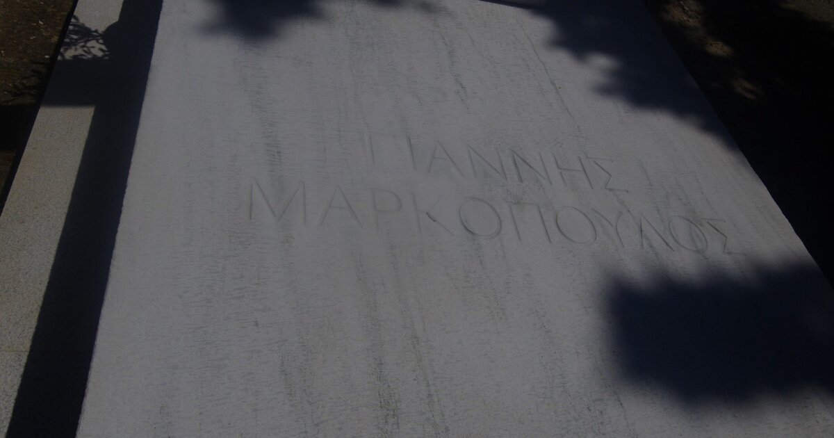 Όλοι τους βρέθηκαν με σεβασμό αλλά πιο πολύ με δέος για τη συγκλονιστική δημιουργική ύπαρξή του, μπροστά στον τάφο του Γιάννη Μαρκόπουλου και όχι ολόγυρά του. Σ’ έναν τάφο μαρμάρινο, απέριττο μες στη λευκότητά του, που επάνω του ήταν χαραγμένο μονάχα το όνομά του. Δεν είχε πουθενά το σύμβολο του σταυρού, κάτι που το πρόσεξε μόνο ο ιερέας που έκανε την επιμνημόσυνη δέηση, γιατί ο δικός του συμβολισμός υψωνόταν στα μάτια όλων σαν γλυπτό που σχημάτιζε ορθή γωνία με τον τάφο και είχε το ίδιο μήκος με αυτόν και το ίδιο υλικό. Ήταν το γλυπτικό δημιούργημα ενός φίλου του και παριστάνει άνθρωπο που δείχνει με το απλωμένο χέρι του τον ουρανό. Παράλληλες γραμμές όμως είναι ενσωματωμένες στο στήθος του, που αναπαριστούν χορδές μουσικού οργάνου και γι’ αυτό η προέκταση του σώματος με το ανυψωμένο χέρι δεν δείχνει τον ουρανό κάποιου που φεύγει από τη ζωή, αλλά ανάταση ψυχής.