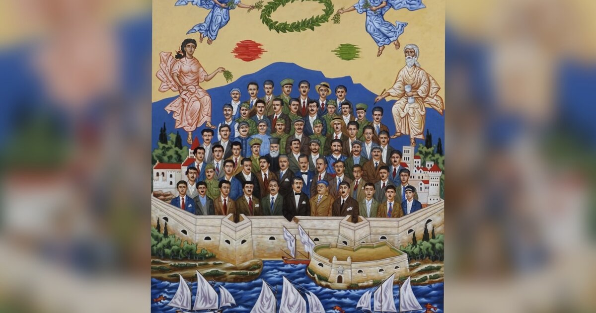 Στην ανωτέρω φωτογραφία διακρίνονται η κυρία Λία Καρέλλη σύζυγος του Μ. Καρέλλη, ο πρώην Δήμαρχος Βασίλης Λαμπρινός, ο ζωγράφος Αριστόδημος και φυσικά το έργο του με τους 62 Μάρτυρες.