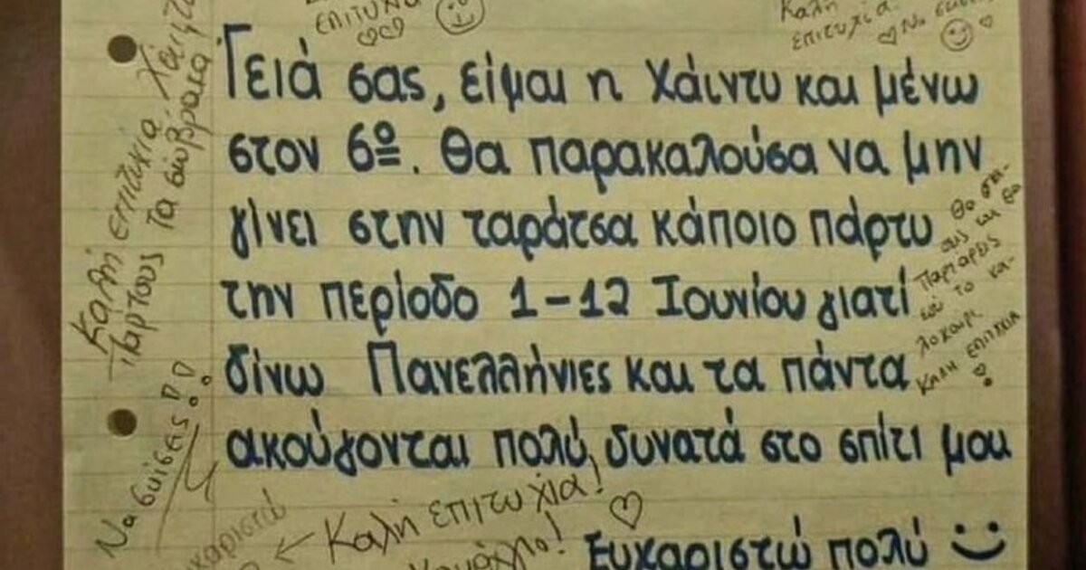 Η Χάιντυ του 6ου ορόφου, στα «ορεινά» (μην ξεχνιόμαστε μέρες εκλογών διανύαμε) μιας πολυκατοικίας έδινε πανελλήνιες εξετάσεις και άφησε ένα σημείωμα στο ασανσέρ με όμορφο γραφικό χαρακτήρα: «…Γειά σας είμαι η Χάιντυ και μένω στον 6ο όροφο θα παρακαλούσα να μη γίνει κάποιο πάρτυ στην ταράτσα την περίοδο 1-12 Ιουνίου γιατί δίνω πανελλήνιες και τα πάντα ακούγονται πολύ δυνατά σπίτι μου… Ευχαριστώ πολύ» Στην οικοδομή τα περισσότερα διαμερίσματα είναι τύπου airbnb, που σημαίνει άγνωστοι μεταξύ τους, ξένοι, περαστικοί, αδιάφοροι για το ποιος μένει στην ίδια οικοδομή, χωρίς να γνωρίζουν το παιδί.