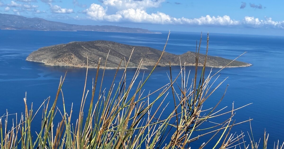 Μόνιμο κάδρο του οπτικού μου πεδίου από τα βορειοδυτικά εδώ και μισόν αιώνα, δεσπόζει με τους άγριους και μολυβένιους γκρεμούς του που βάφονται κάθε μέρα με τα απόκοσμα πυρόξανθα χρώματα της δύσης, στην ποδιά των Σητειακών βουνών. Είναι δεκάδες οι φορές που τα σμαραγδένια και τυρκουάζ νερά του έχουν χαρίσει κοντινές ονειρικές αποδράσεις για κολύμπι και ψαρέματα. Αλλά και άλλες τόσες που ο ανασκαμμένος μινωικός οικισμός της, σε ταξιδεύει χιλιετίες πίσω, μιλώντας στην κυριολεξία με τις πέτρες, έτσι που πυρωμένες καθώς είναι κάτω από τον αυγουστιάτικο ήλιο, σου προφέρουν (και σου προσφέρουν) σαν ζεστό κρητικό προζυμένιο ψωμί αυτή τη μινωίτικη λαλιά που νιώθεις κατ’ εξαίρεση να την καταλαβαίνεις σαν τις ακουμπάς.