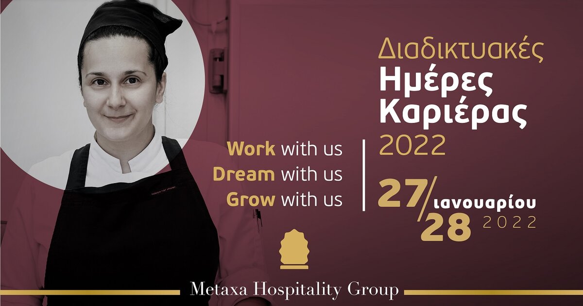 Με κεντρικό μήνυμα «Εργαστείτε Μαζί μας – Ονειρευτείτε Μαζί μας – Εξελιχθείτε Μαζί μας», το Τμήμα Ανθρώπινου Δυναμικού του Metaxa Hospitality Group διοργανώνει «Διαδικτυακές Ημέρες Καριέρας», αναζητώντας νέα μέλη για την ομάδα του σε Κρήτη και Σαντορίνη, για την περίοδο του 2022.