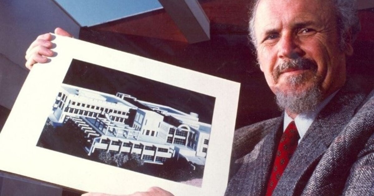 Τέλη δεκαετίας 1980: Ο Λευτέρης Οικονόμου, ο μακροβιότερος πρόεδρος του ΙΤΕ (1983-2004), κρατά φωτογραφία της μακέτας του μελλοντικού κεντρικού κτηρίου ΙΤΕ.