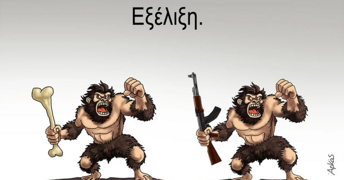 Στο σκίτσο του εμφανίζεται ο άνθρωπος των σπηλαίων, πρώτα με ένα ρόπαλο και ύστερα με ένα καλάσνικοφ. "Εξέλιξη»" είναι το σχόλιο που συνοδεύει την εικόνα.