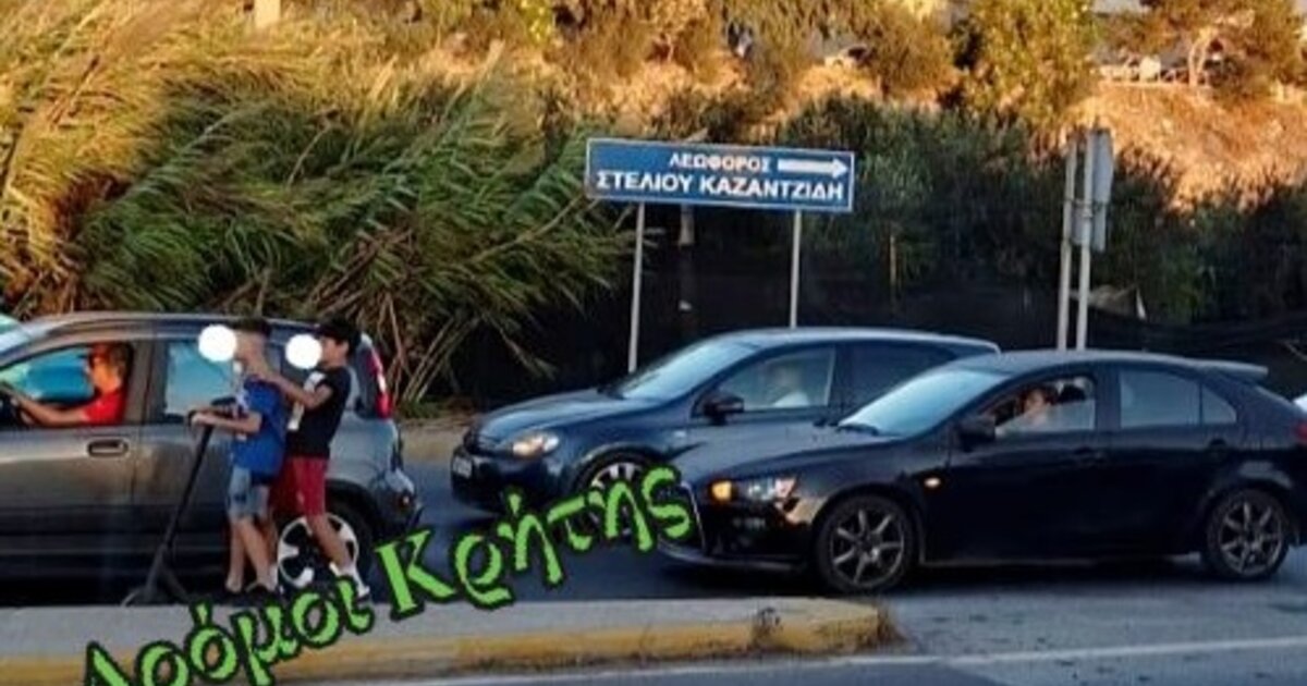 Στη φωτογραφία που βλέπετε και η οποία αναρτήθηκε στην ομάδα του Facebook "Δρόμοι Κρήτης" δύο μικρά παιδιά κινούνται με πατίνι σε δρόμο μεγάλης κυκλοφορίας όπου αναπόφευκτα αναπτύσσονται ταχύτητες.