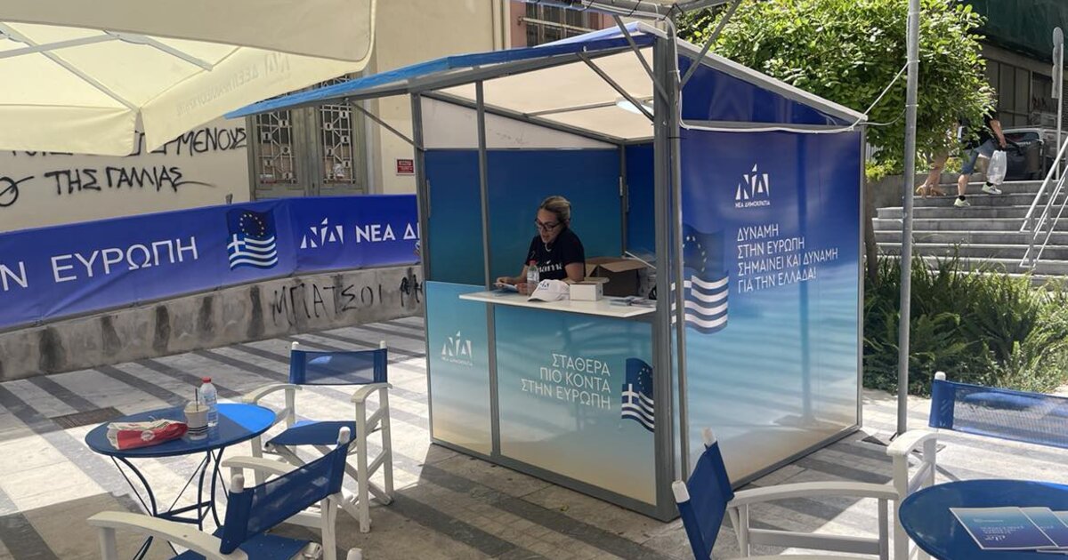 Η ΝΔ έχει στήσει το εκλογικό της περίπτερο απέναντι από το καφέ "Μωσαϊκό", στην εσοχή του δρόμου της Λ. Δικαιοσύνης και από εκεί θα διακινεί το εκλογικό αλλά και προεκλογικό υλικό της.