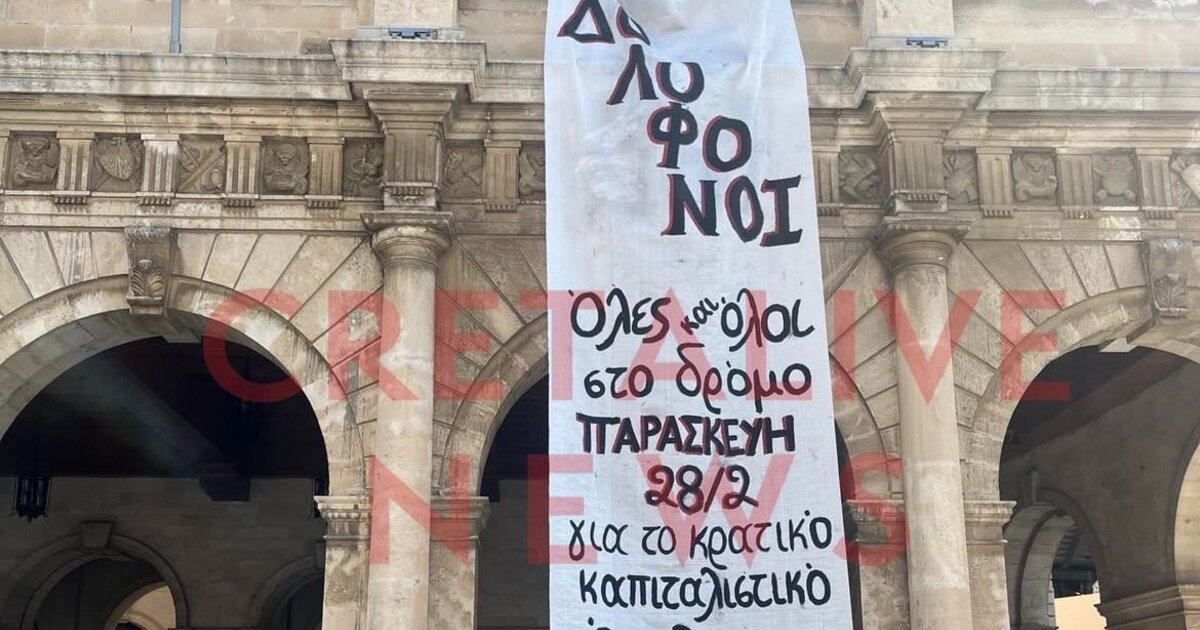 Ένα τεράστιο πανό, κρέμασαν από το παράθυρο της αίθουσας συνεδριάσεων του Δημοτικού Συμβουλίου Ηρακλείου στη Λότζια, αντιεξουσιαστές του Ευαγγελισμού, καλώντας σε συμμετοχή στην συγκέντρωση και την πορεία διαμαρτυρίας για τα θύματα των Τεμπών, την Παρασκευή στις 11 το πρωί, στην πλατεία Ελευθερίας!
