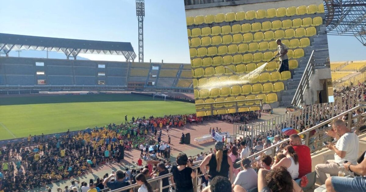 Μέσα σε όλα, την ώρα της βράβευσης των παιδιών, αποφασίστηκε να γίνει ο καθαρισμός στις εξέδρες, προκαλώντας δυσμενή σχόλια και… θυμηδία στους παρευρισκόμενους! Πολίτες μάλιστα ανέφεραν ότι ένας μονάχα άνθρωπος, ο εικονιζόμενος στη φωτογραφία, "πάλευε" με το λάστιχο μέσα στη ζέστη.