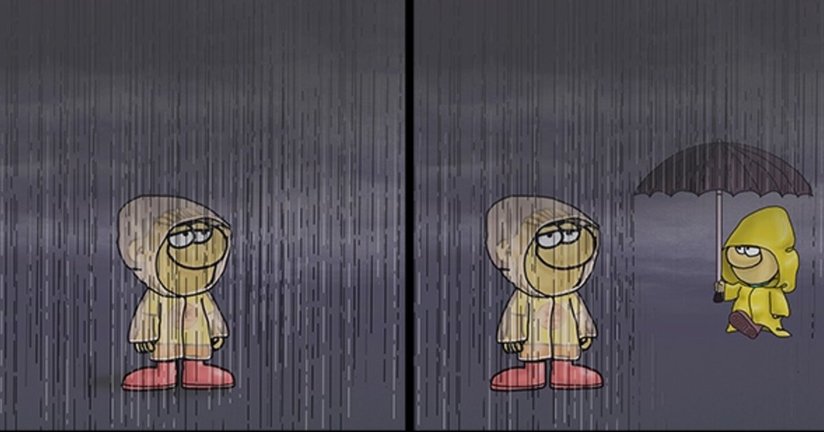 Το δεύτερο παιδί κρατά στα χέρια του μια ομπρέλα κι έτσι πλησιάζει το πρώτο παιδί με σκοπό να προστατευτούν και οι δύο από τα έντονα καιρικά φαινόμενα. Βέβαια, ενώ κάθονται κάτω από την ομπρέλα, το πρώτο παιδί αρπάζει την ομπρέλα, με αποτέλεσμα το παιδί που του την έδωσε να μείνει λίγο παραπέρα να βρέχεται.