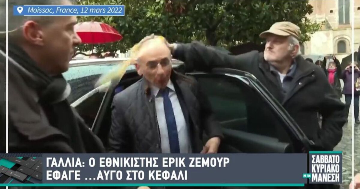 Καμία ... αβρότητα στην υποδοχή του εθνικιστή Ερίκ Ζεμουρ σε πόλη της νοτιοδυτικής Γαλλίας. Είναι υποψήφιος για την προεδρία στις εκλογές του Απρίλη στη Γαλλία, ωστόσο κατά την άφιξή του στην πόλη Μοζά, άγνωστος εκσφενδόνισε αυγό, το οποίο "πέτυχε" το κεφάλι του πολιτικού.