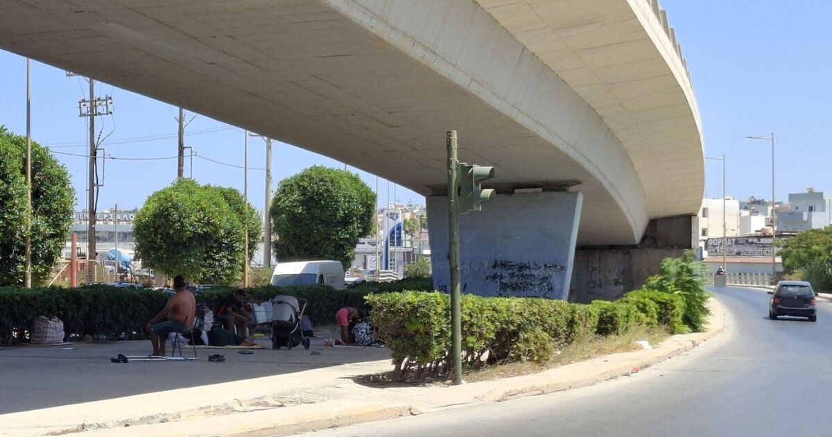 Κάτω από τη σκιά της γέφυρας έχουν στηθεί καρέκλες, παιδικά καροτσάκια και διάφορα προσωπικά αντικείμενα, ενώ κάποιοι κάθονται ή ξεκουράζονται στο τσιμεντένιο δάπεδο. Ο χώρος, που συνήθως προορίζεται για κυκλοφοριακή υποδομή, έχει πλέον αποκτήσει χαρακτήρα προσωρινής κατοικίας.