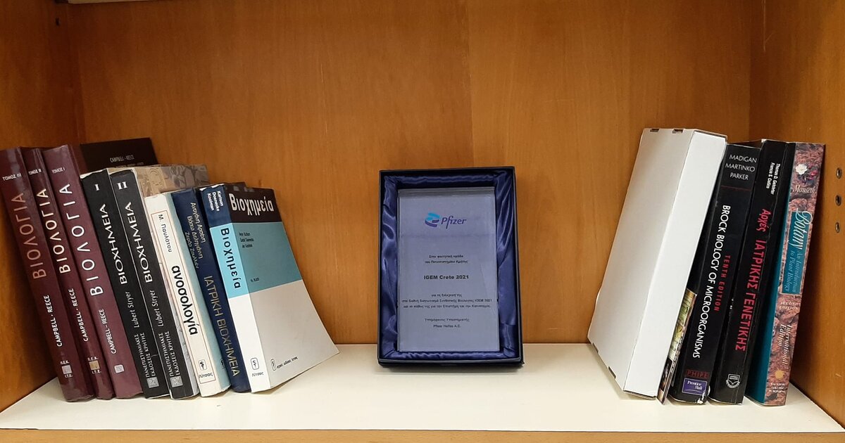 Μόλις κατέφτασε στο Πανεπιστήμιο Κρήτης ένα βραβείο από την Pfizer για την επιτυχία της ομάδας iGEM–CRETE στο παγκόσμιο διαγωνισμό Συνθετικής Βιολογίας!