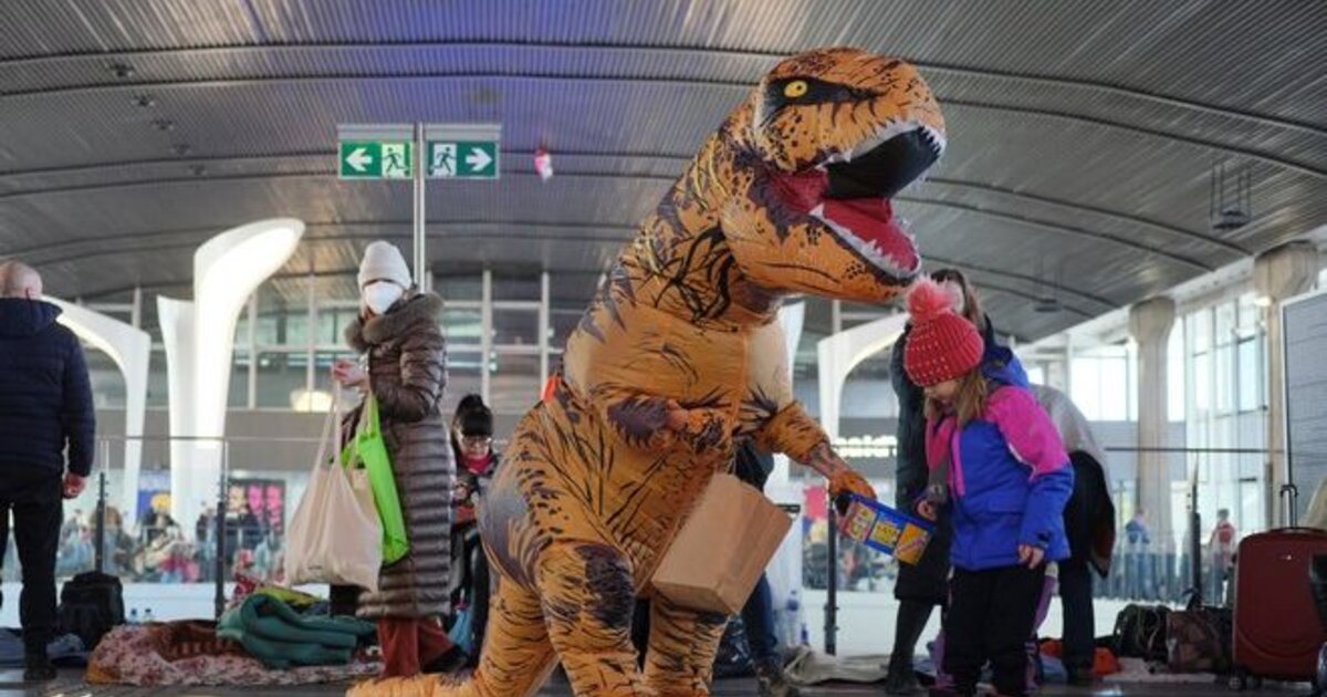 Ένας Πολωνός ντύνεται δεινόσαυρος και διασκεδάζει τα παιδιά από την Ουκρανία