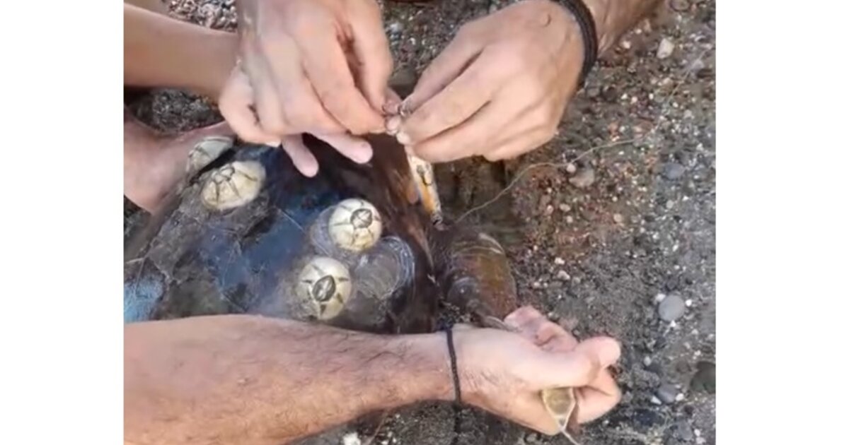 Η χελώνα εντοπίστηκε μπλεγμένη σε τριπλό αγκίστρι δολώματος