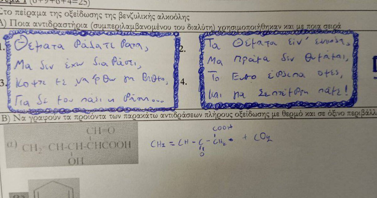 Όπως γνωστοποιεί ο Δρ. Αντώνης Κουβαράκης, ΕΔΙΠ Οργανική Χημεία, ο φοιτητής του παρέδωσε την εξής κόλλα, όπου αναφέρονται οι παρακάτω, έξυπνοι ομολογουμένως, στίχοι: