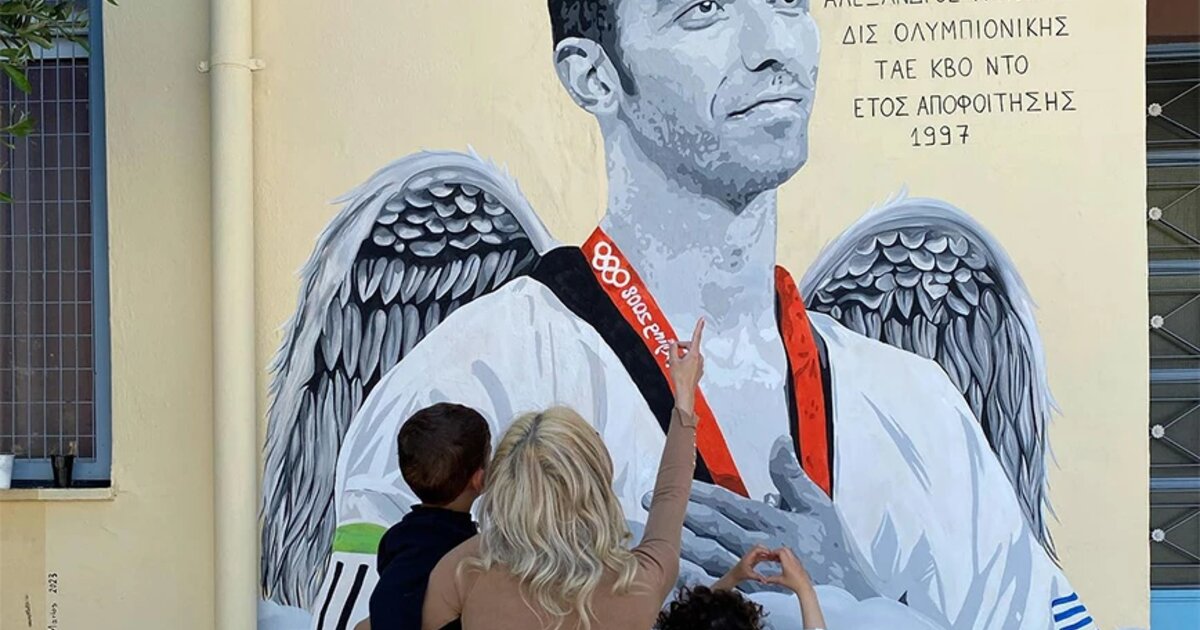 Γκράφιτι με φτερά αγγέλου, στον τοίχο του σχολείου που φοιτούσε στη Σταυρούπολη της Θεσσαλονίκης, έγινε ο σπουδαίος Ολυμπιονίκης τάε κβον ντο, Αλέξανδρος Νικολαΐδης έξι μήνες μετά τον θάνατο του.
