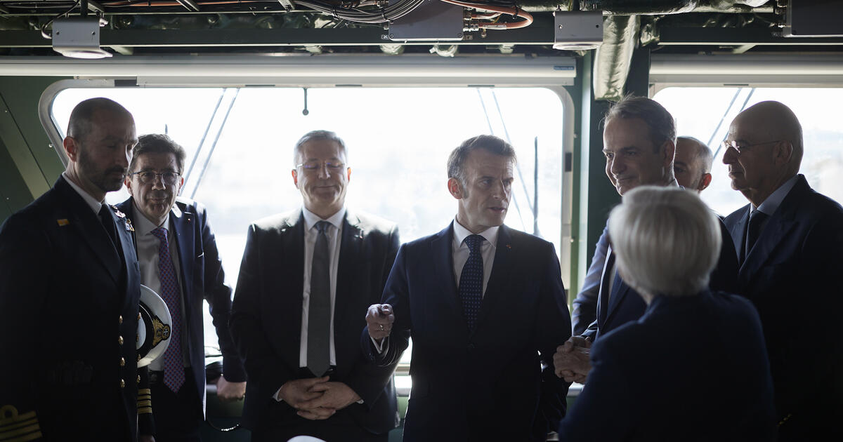 Κατά την επίσκεψή τους στη φρεγάτα οι κ.κ. Μητσοτάκης και Μακρόν συνομίλησαν με τον κυβερνήτη της πλοίαρχο Ιωάννη Κιζάνη.