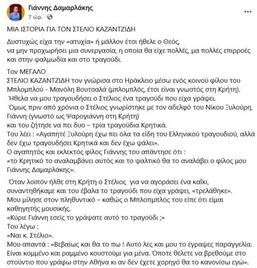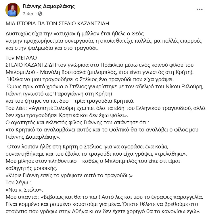 "Σίγουρα θα είχε πολλές, μα πολλές επιρροές και στην ψαλμωδία και στο τραγούδι" - γράφει στην ανάρτησή του ο κ.Δαμαρλάκης και περιγράφει τη γνωριμία του στο Ηράκλειο με τον Στέλιο Καζαντζίδη, μέσω του "ανθρώπου" του Καζαντζίδη στην Κρήτη, Μανόλη Βουτσαλά (Μπλομπλού).