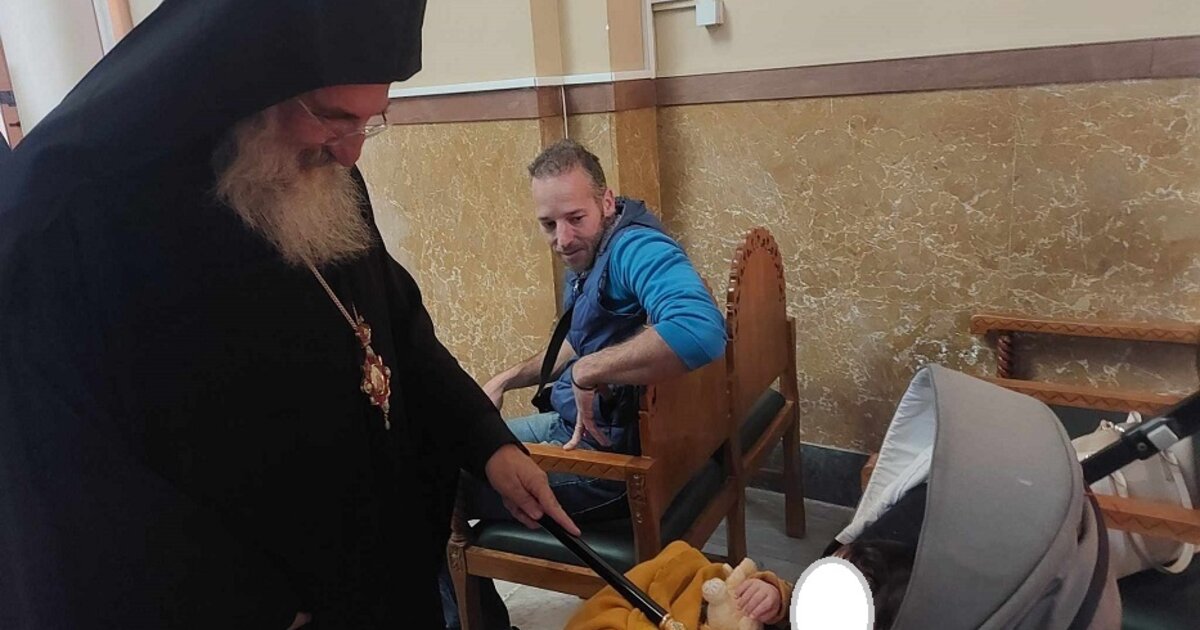 Με την ποιμενική του ράβδο, ο Σεβασμιότατος Αρχιεπίσκοπος Κρήτης, κκ Ευγένιος έδωσε την ευχή του, σήμερα, στον μόλις 8 μηνών Απόστολο που καθόταν υπομονετικά στο καροτσάκι του και παρακολουθούσε!