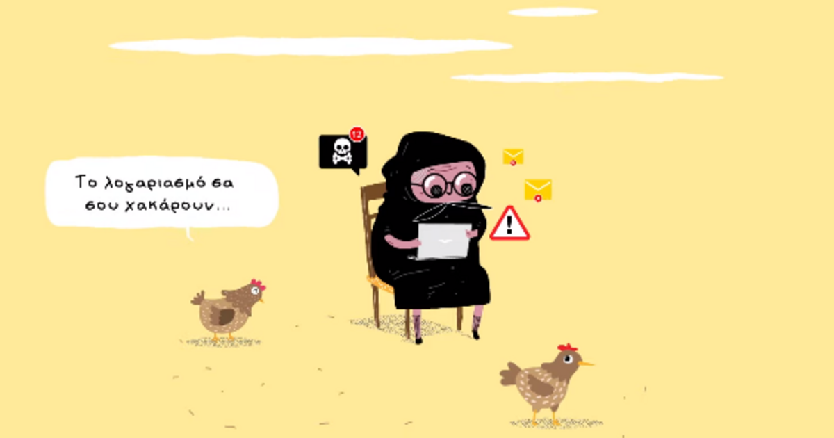 Με μια συμπαθέστατη γιαγιά, που ανακαλύπτει ότι παραβίασαν τον λογαριασμό της ξεκινά το βίντεο που προέκυψε από τη συνεργασία του Ελληνικού Κέντρου Ασφαλούς Διαδικτύου με την Εθνική Αρχή Κυβερνοασφάλειας και μας προσφέρει... διαδικτυακές πρώτες βοήθειες!