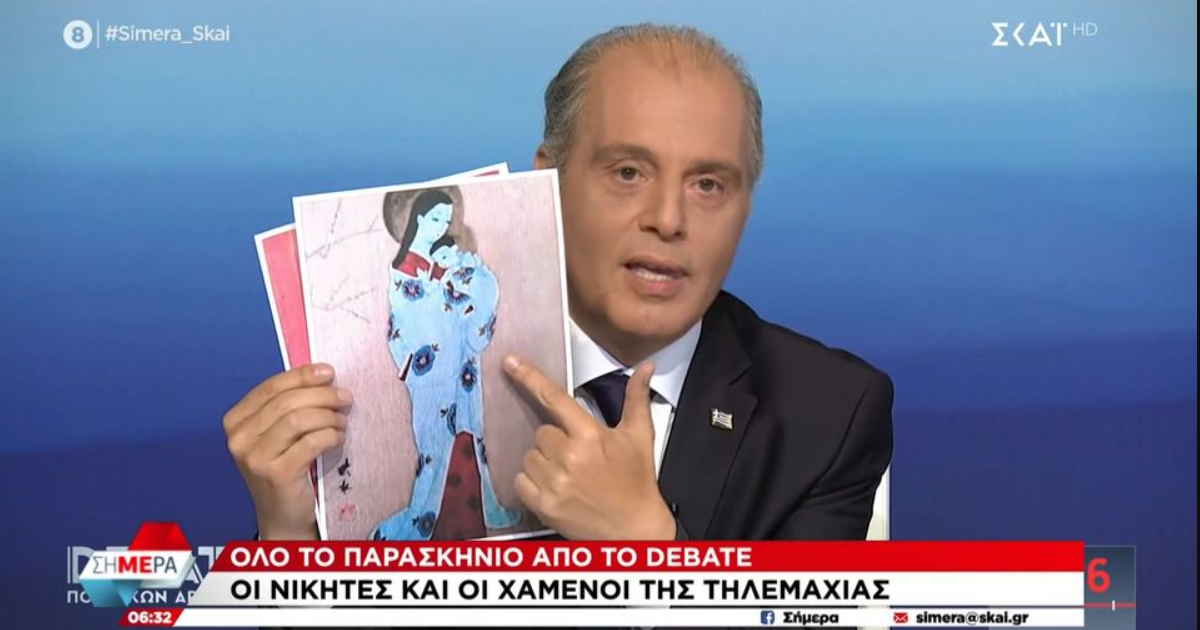 Με μια εικόνα της Παναγίας... γκέισα από βιβλίο του δημοτικού αντέδρασε ο Κυριάκος Βελόπουλος, όταν ρωτήθηκε στο debate για το αν οι θέσεις του «υπαγορεύονται μόνο από την ορθοδοξία».