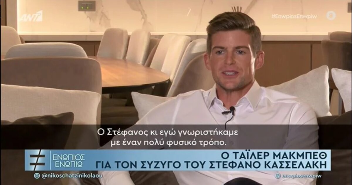 Την πρώτη του συνέντευξη, μετά την εκλογή του Στέφανου Κασσελάκη στην ηγεσία του ΣΥΡΙΖΑ έδωσε απόψε, ο σύζυγός του, Τάιλερ Μακμπέθ, στην εκπομπή «Ενώπιος Ενωπίω», με τον Νίκο Χατζηνικολάου, στον ΑΝΤ1.