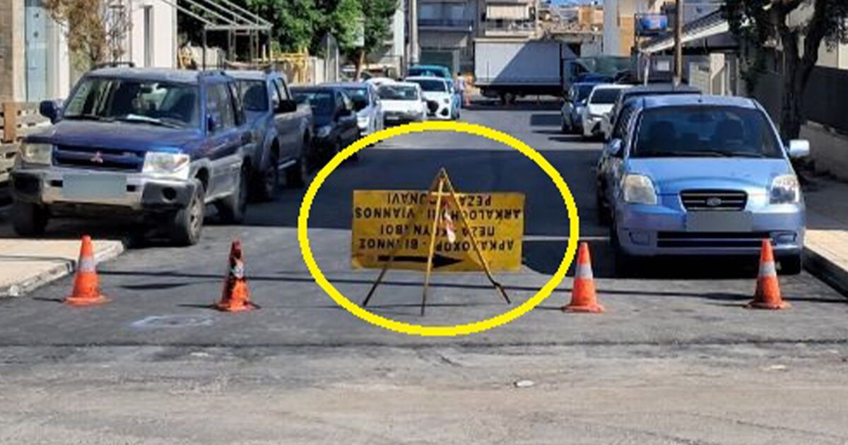 Στη φωτογραφία βλέπουμε ένα γνώριμο αστικό τοπίο του Ηρακλείου - οδοί με πολυκατοικίες και σταθμευμένα οχήματα με τα εν εξελίξει έργα οδοποιίας στο βάθος του δρόμου. Εκεί έχει τοποθετηθεί πρόχειρα μια τρίποδη προειδοποιητική πινακίδα, συνοδευόμενη από κώνους σήμανσης.