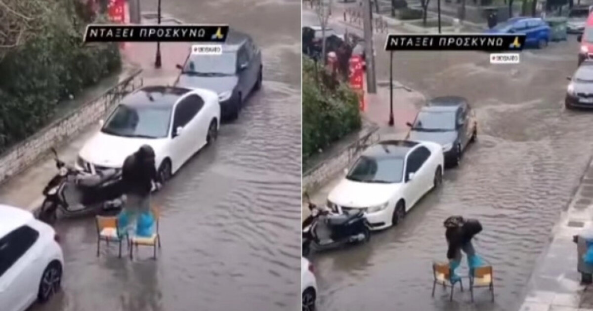 Όπως φαίνεται στο βίντεο, ο άνδρας, με τη βοήθεια δύο καρεκλών και αρκετά ακροβατικά διέσχισε έναν πλημμυρισμένο δρόμο.