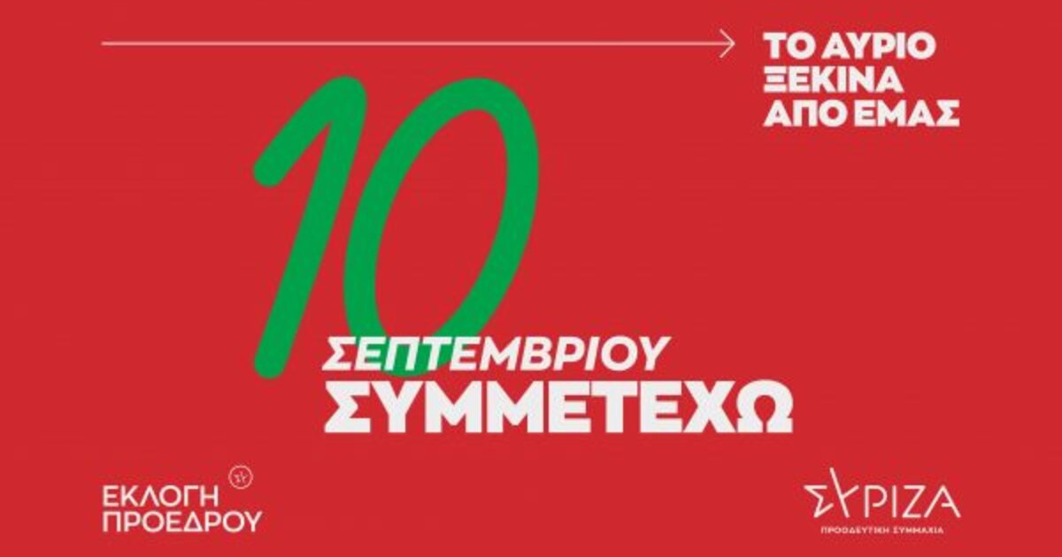 Ενημερωτική καμπάνια ενόψει της εκλογής προέδρου στις 10 Σεπτεμβρίου ξεκινά ο ΣΥΡΙΖΑ επιλέγοντας ως κεντρικό σύνθημα «10 Σεπτεμβρίου Συμμετέχω – Το αύριο ξεκινά από εμάς». Σκοπός της καμπάνιας αυτής είναι η ενημέρωση και παράλληλα η ενεργοποίηση των πολιτών, καθώς το ζητούμενο είναι η κρίσιμη κομματική διαδικασία να προσλάβει χαρακτήρα πολιτικού γεγονότος μείζονος σημασίας.