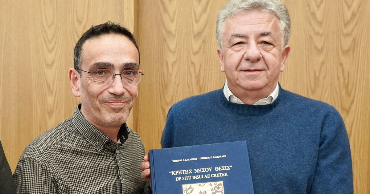 Ο Σταύρος Αρναουτάκης παρέδωσε στον Γραμματέα το αναμνηστικό δώρο, το οποίο είναι η συλλεκτική χαρτογραφική έκδοση «ΚΡΗΤΗΣ ΝΗΣΟΥ ΘΕΣΙΣ» (De Situ Insulae Cretae). Ο Περιφερειάρχης ευχήθηκε στον Δημήτρη Βρύσαλη καλή χρονιά, δημιουργική και διεκδικητική, τονίζοντας τη σημασία της καλής συνεργασίας στο Περιφερειακό Συμβούλιο για το καλό του τόπου.