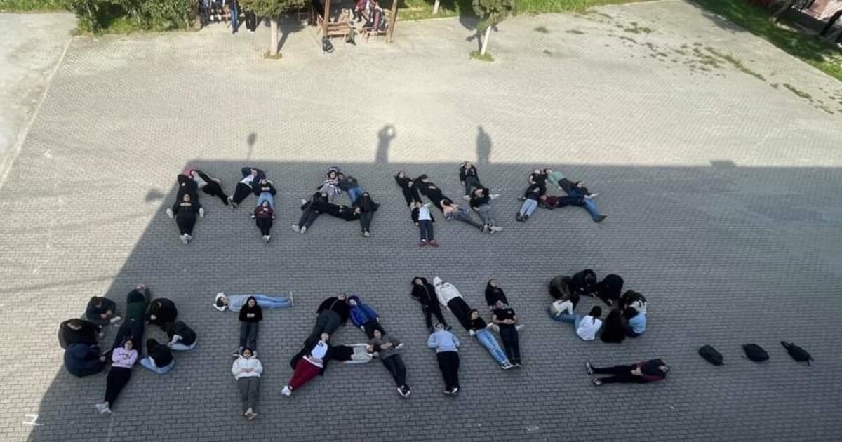 Οι μαθητές από το Γυμνάσιο και Λύκειο Κρουσώνα, με τα κορμιά τους "έγραψαν" στην αυλή του σχολείου τη φράση "Μαμά, φτάνω..."
