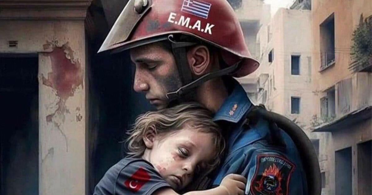 Πρόκειται για την επεξεργασμένη φωτογραφία που δείχνει έναν διασώστη της ΕΜΑΚ να κρατά στην αγκαλιά του ένα μικρό κοριτσάκι.