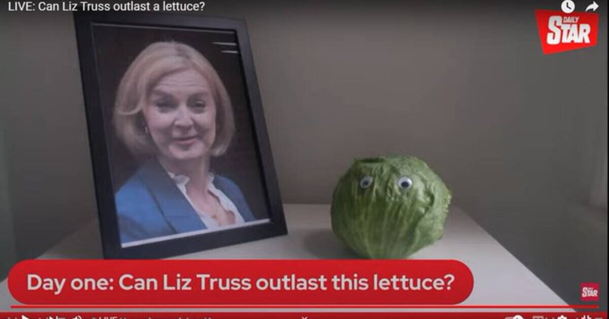 Η βρετανική σκανδαλοθηρική εφημερίδα Daily Star είχε στήσει μια ιδιότυπη "κούρσα" την περασμένη Παρασκευή, δείχνοντας σε ζωντανή διαδικτυακή ροή ένα μαρούλι εκτός ψυγείου δίπλα σε μια φωτογραφία της Λιζ Τρας, ρωτώντας τους αναγνώστες: «Μπορεί ένα μαρούλι εκτός ψυγείου να διαρκέσει περισσότερο από την θητεία της Τρας»;
