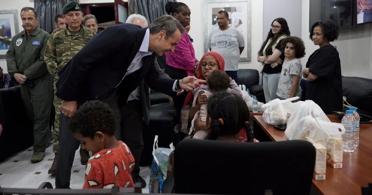 Ο Κυριάκος Μητσοτάκης συναντήθηκε στην αεροπορική βάση της Ελευσίνας με τους διασωθέντες από το εμπόλεμο Σουδάν, λίγο μετά την προσγείωση του C-130, το οποίο τους μετέφερε.