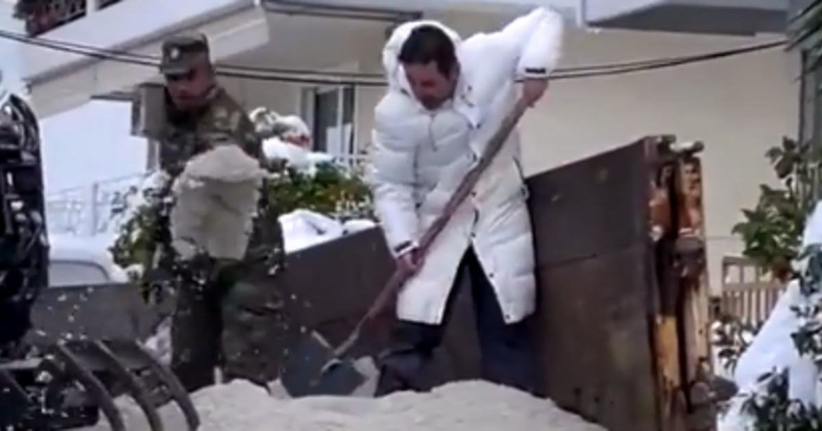 Όπως φαίνεται και σε βίντεο που ανέβηκε στο Τwitter, ο κ. Μαρκόπουλος έχει πάρει το φτυάρι και από την καρότσα του φορτηγού που μεταφέρει αλάτι το ρίχνει πάνω στον πάγο, μαζί με στρατιώτες.