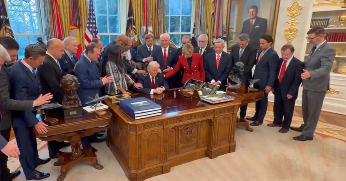 Viral έχει γίνει από χθες, Παρασκευή, το βίντεο στο οποίο ευαγγελικοί ηγέτες προσεύχονται γύρω από τον Ντόναλντ Τραμπ στο Οβάλ Γραφείο του Λευκού Οίκου, που δημοσίευσε στα μέσα κοινωνικής δικτύωσης ο στενός συνεργάτης του προέδρου, Νταν Σκαβίνο.