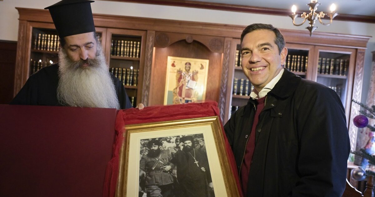 Κατά τη διάρκεια της επίσκεψής του, ο Αλέξης Τσίπρας συναντήθηκε και με τον Μητροπολίτη Φθιώτιδας Συμεών ο οποίος του ετοίμασε ένα ιδιαίτερο δώρο. Του χάρισε σε κορνίζα μια ιστορική φωτογραφία, στην οποία απεικονίζεται ο Άρης Βελουχιώτης κατά την είσοδό του στην πόλη της Λαμίας μαζί με τον παπά- Ανυπόμονο. Ο Μητροπολίτης Φθιώτιδας μάλιστα είχε ετοιμάσει και ιδιόχειρη αφιέρωση στο δώρο του για τον πρόεδρο του ΣΥΡΙΖΑ.