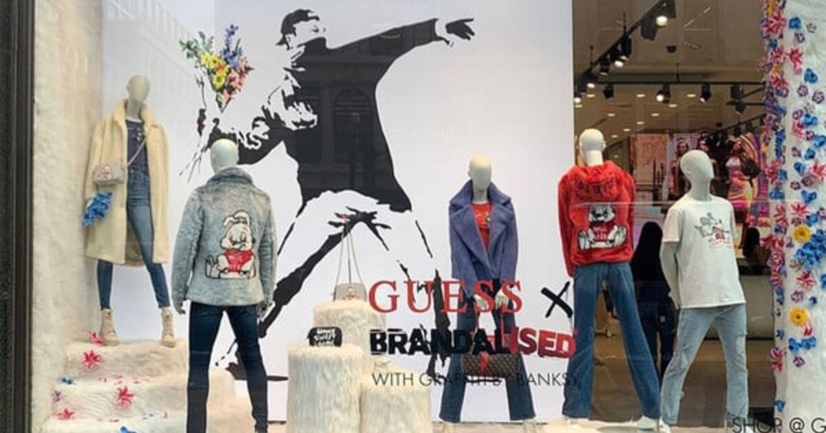 Έργο του Banksy κοσμεί βιτρίνα καταστήματος της Guess, με τον διάσημο καλλιτέχνη να κατηγορεί το brand για κλοπή πνευματικής ιδιοκτησίας.