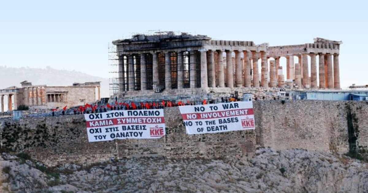 «Όχι στον πόλεμο, καμία συμμετοχή, όχι στις βάσεις του θανάτου», είναι το μήνυμα που αναγράφεται στο πανό που ανάρτησε το πρωί το ΚΚΕ στην Ακρόπολη.