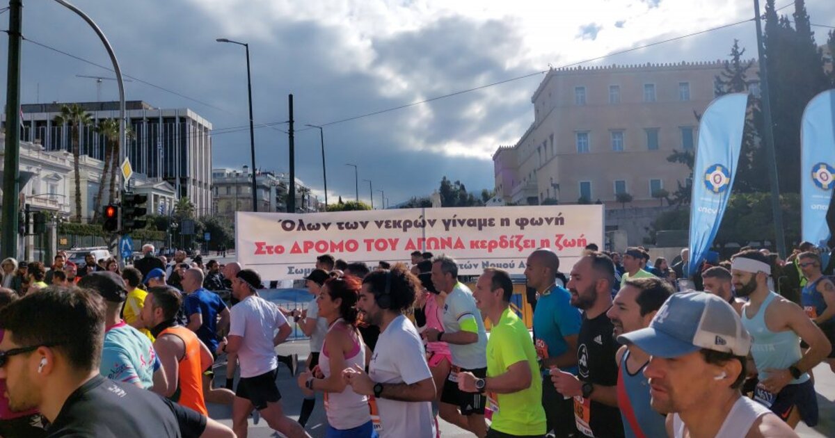 Παρέμβαση για τα Τέμπη, στον 11ο Ημιμαραθώνιο Αθήνας, από το σωματείο γυμναστών και προπονητών Αττικής και φοιτητικούς συλλόγους.