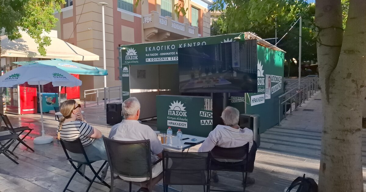 Η ανακοίνωση του exit poll στο εκλογικό περίπτερο του ΠΑΣΟΚ στο Ηράκλειο