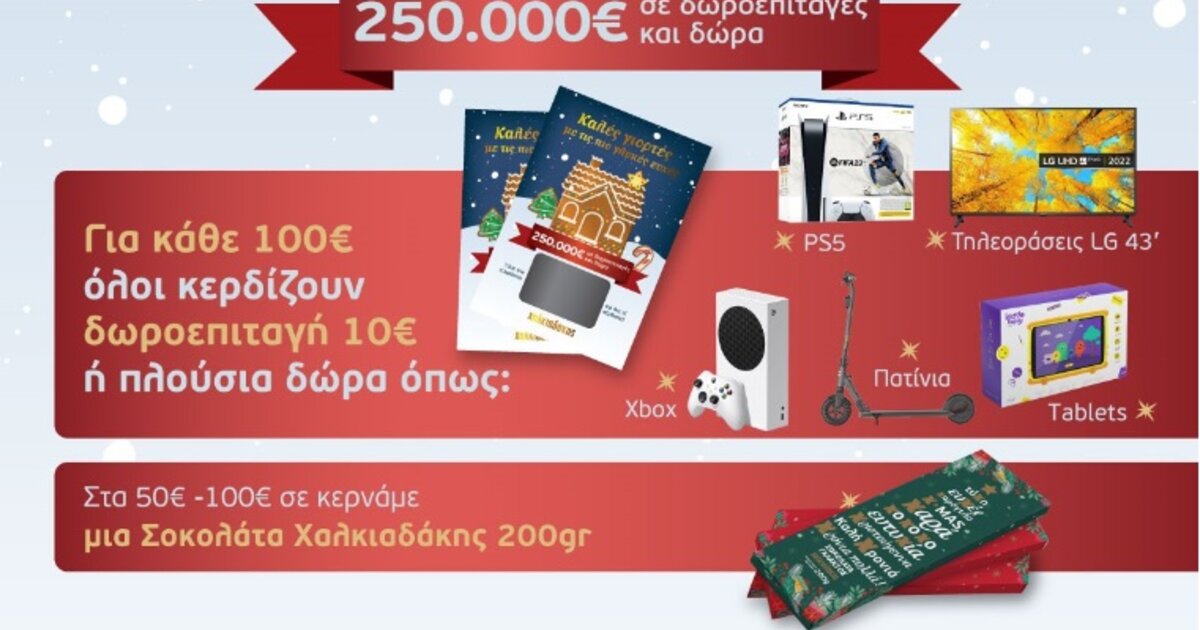 Παράλληλα, όμως, ειδικά για τη φετινή εορταστική περίοδο και μέχρι τις 31 Δεκεμβρίου, τα super market Χαλκιαδάκη μοιράζουν δωροεπιταγές αλλά και δώρα για όλη την οικογένεια, αξίας 250.000 ευρώ και μάλιστα χωρίς κλήρωση! Για κάθε 100 ευρώ αγορών στα καταστήματα της αλυσίδας όλοι κερδίζουν μια δωροεπιταγή 10 ή 50 ή 100 ευρώ, ή όμορφα δώρα όπως ηλεκτρικές και ηλεκτρονικές συσκευές, είδη για το σπίτι κ.ά. που ενθουσιάζουν μικρούς και μεγάλους.