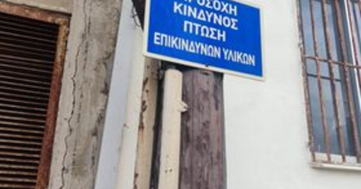 Ο Δήμος έχει τοποθετήσει μία πινακίδα που προειδοποιεί όποιον περνάει από το σημείο ότι υπάρχει κίνδυνος να πέσουν επικίνδυνα υλικά, όπως και γίνεται!