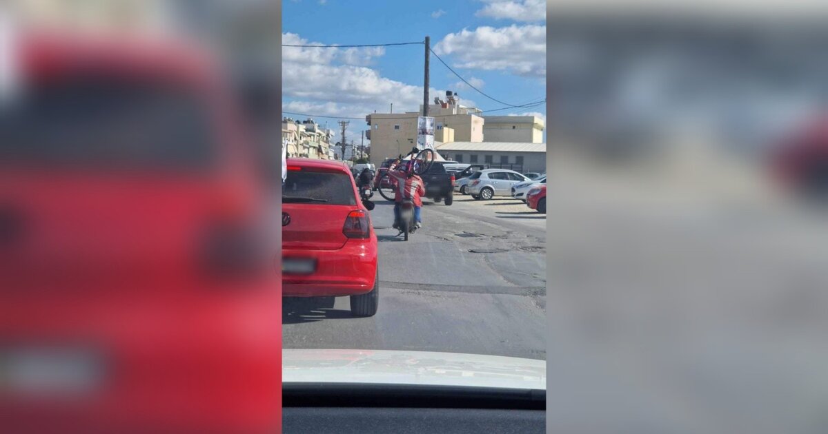 Ηράκλειο ... όχι Μπαγκλαντές! Οδός Χριστομιχάλη Ξυλούρη και το θέαμα ... το εξής παράδοξο: Κάποιος φόρτωσε στον ώμο ένα ποδήλατο, ανέβηκε στο μηχανάκι και πήρε το δρόμο του! Το πως έφτασε στον προορισμό του δεν το γνωρίζουμε, όμως αυτό που όλοι αντιλαμβανόμαστε είναι ότι σε αυτή τη χώρα το "πάμε κι όπου βγει" αφορά ... πολλούς...