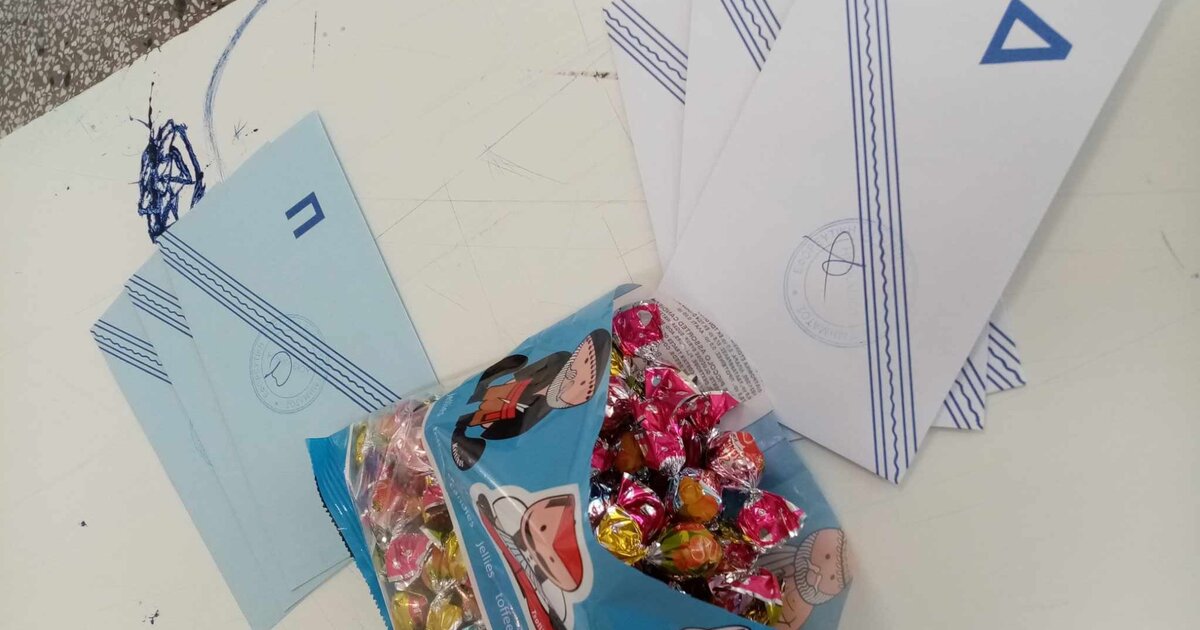 Μαζί με τα ψηφοδέλτια που παίρνει στα χέρια του ο κάθε ψηφοφόρος, παίρνει και μια καραμέλα, κέρασμα από τη δικαστική αντιπρόσωπο, εκπλήσσοντας όσους προσέρχονται για να ψηφίσουν.