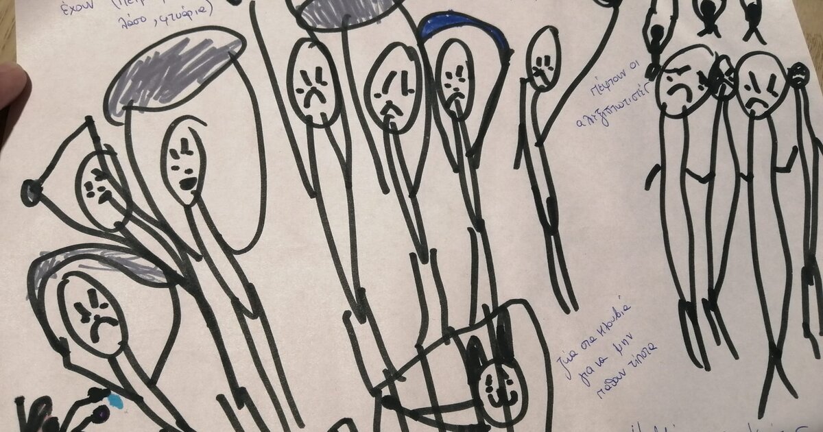 Το παιδί γράφει στη ζωγραφιά του «πέφτουν οι αλεξιπτωτιστές», «πολεμούν όλοι με ό,τι έχουν (πέτρες, σχοινιά, λάσο, φτυάρια)»...